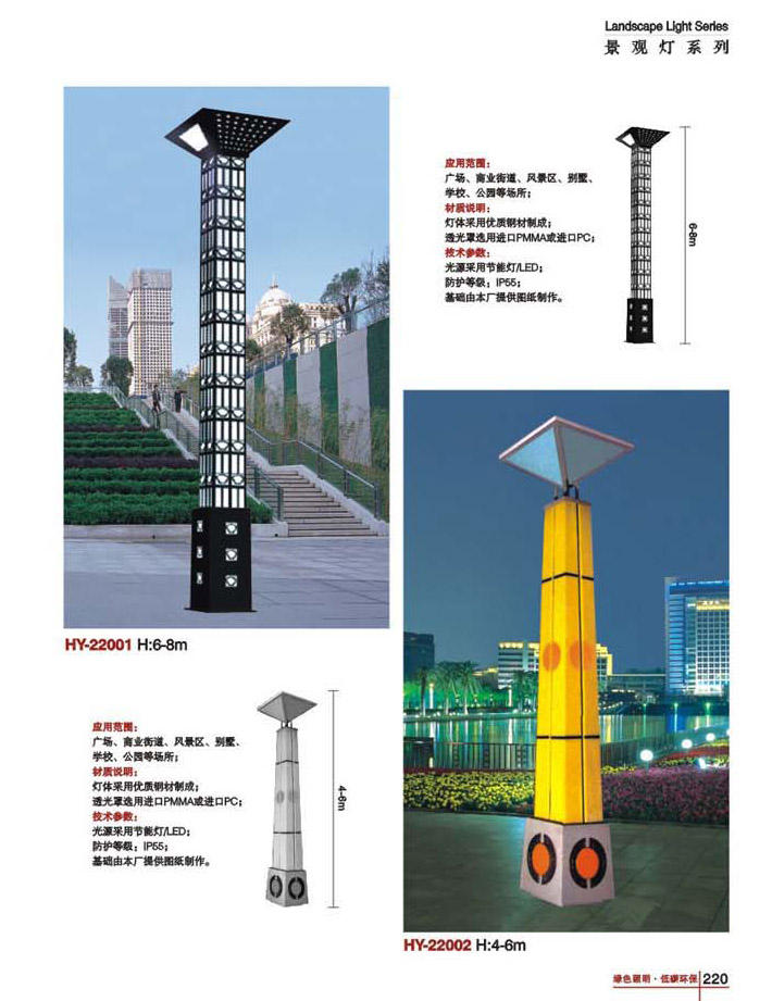 用途:景觀燈適用市政工程、園林亮化工程和公園、開發(fā)區(qū)、別墅區(qū)、廣場等戶外路燈照明工程